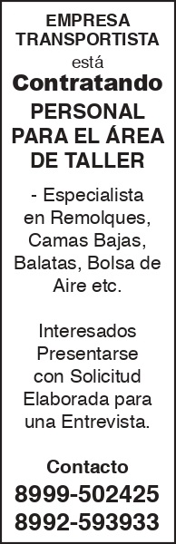 empresa transportista esta contratando *personal para el area de taller -especialista en remolques, camas bajas, balatas, bolsa de aire etc. interesados presentarse con solicitud elaborada para una entrevista. contacto 8999-5024258992-593933