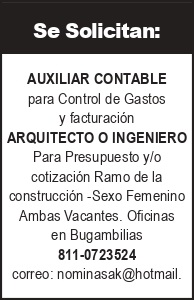 se solicitan: *auxiliar contable para control de gastos y facturacion *arquitecto o ingeniero para presupuesto y/o cotizacion ramo de la construccion -sexo femenino ambas vacantes. oficinas en bugambilias 811-0723524 correo: nominasak@hotmail.
